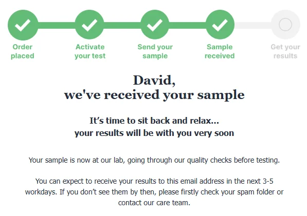 For context, I posted my sample on 23 October and the lab acknowledgement email came through on Monday 3 November. I can’t confirm the exact day the lab physically received the envelope, but this timeline suggests the postal leg is the main variable, while the lab processing itself is fast once your sample is logged.