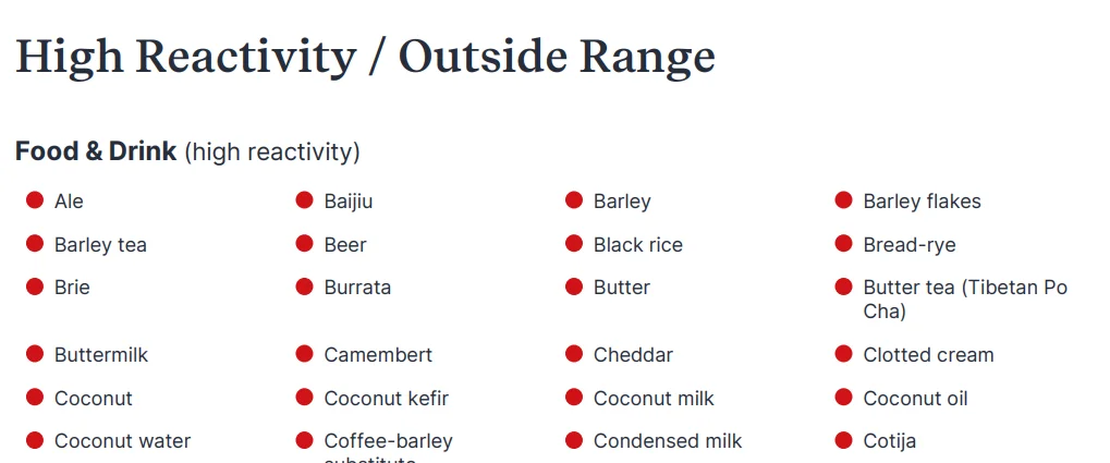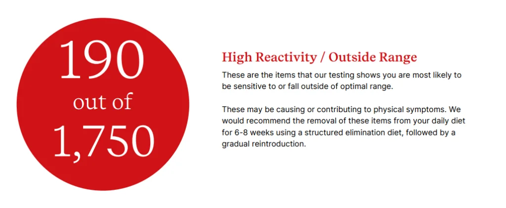 High reactivity items are those the system suggests you are most likely to be sensitive to or where your readings fall outside an “optimal range”. The guidance is to remove these foods for six to eight weeks and then reintroduce them carefully.