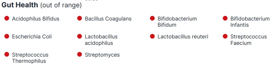 - Gut health markers such as Lactobacillus strains, E. coli and other bacteria.