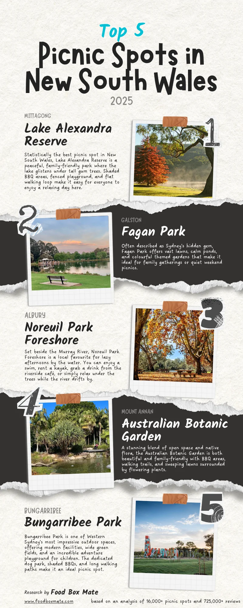 With each venue ranked from top to bottom on each of these 5 metrics, we simply combined all of these rankings with a proprietary weighting algorithm to find your favourite picnic spots in New South Wales.